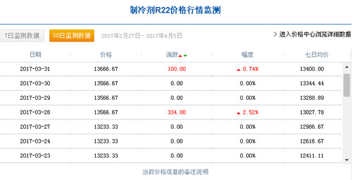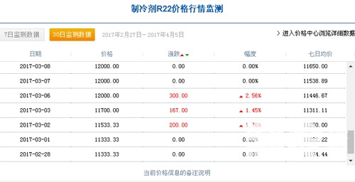 據(jù)有關(guān)數(shù)據(jù)監(jiān)測顯示,3月1日,中國R22制冷劑廠家出廠價(jià)格為11333.33元/噸,3月31日,中國R22制冷劑廠家出廠價(jià)格達(dá)到13666.67元/噸,三月份同比增長20.6%;據(jù)制冷大市場記者了解,2月7日,中國R22制冷劑廠家出廠價(jià)格集中在9883元/噸。