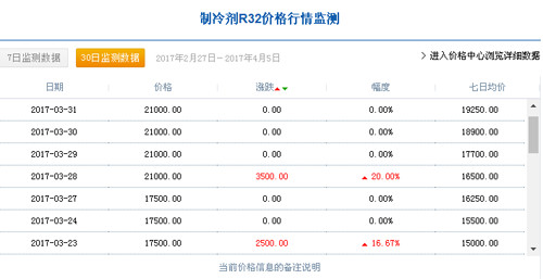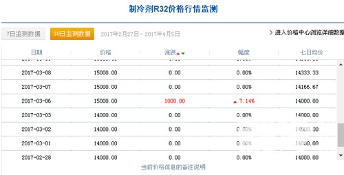3月1日,中國R32制冷劑廠家出廠價(jià)格集中在14000元/噸,3月31日達(dá)到21000元/噸,三月份同比上漲50%;一個(gè)月內(nèi)R32制冷劑漲價(jià)達(dá)到5成。據(jù)制冷大市場記者了解,2月7日,中國R32制冷劑廠家出廠價(jià)格集中在12750元/噸。
